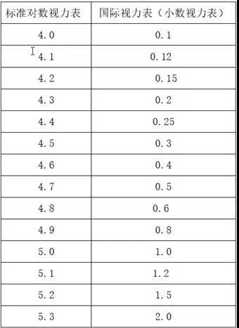 标准对数视力表和国际标准视力表的换算如下: