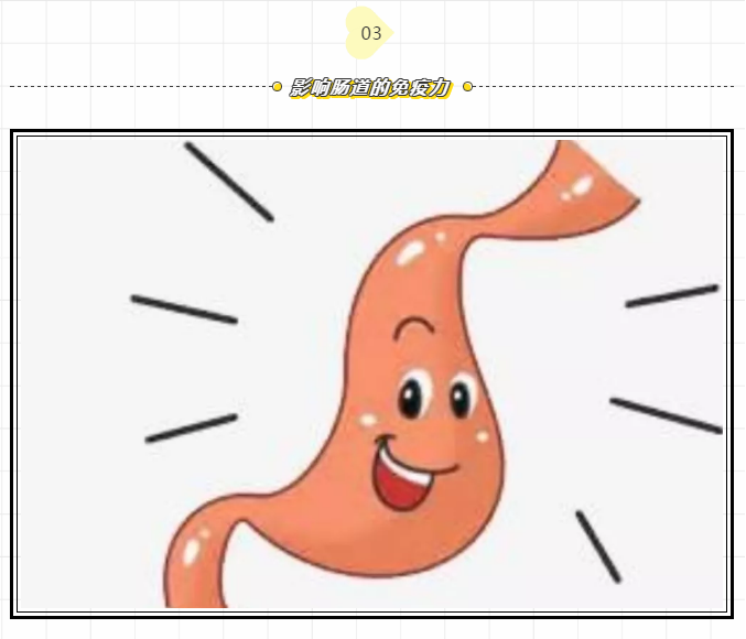 肠道其实是人体最大的免疫器官,其免疫系统约占70%,其中发挥重要作用的有肠道菌群以及各类免疫细胞。但长期高糖饮食会让肠道内有害菌数量上升,引起菌群失衡,容易因此降低免疫力。