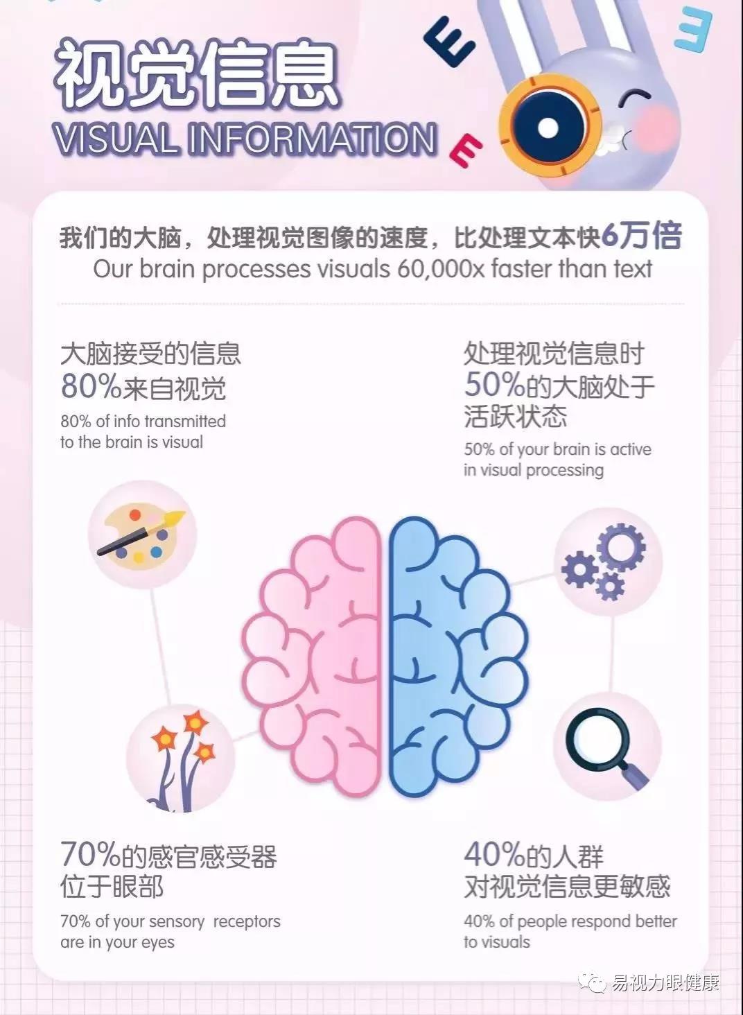 视觉是大脑能够处理眼睛所看到的信息的能力,孩子们学习的80%知识都是通过视觉途径获得的。所以如果视觉处理能力出现问题,孩子们在学习上就无法发挥出最大的潜能。