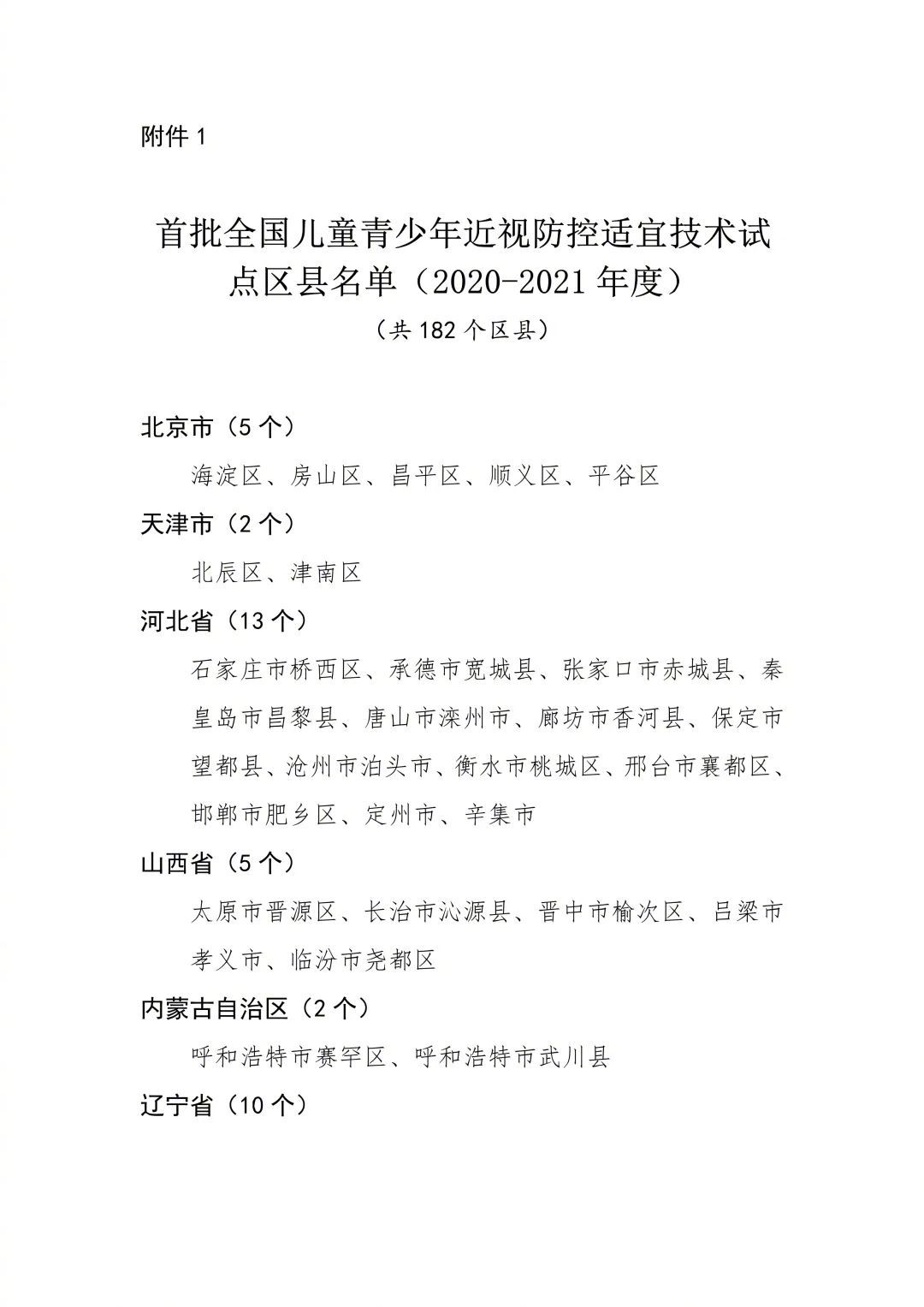 附件:1.首批全国儿童青少年近视防控适宜技术试点区县名单(2020-2021年度)