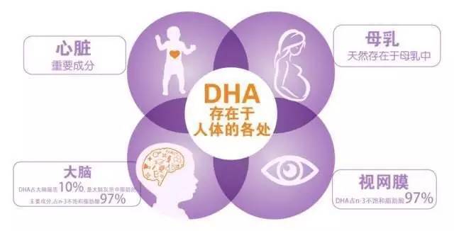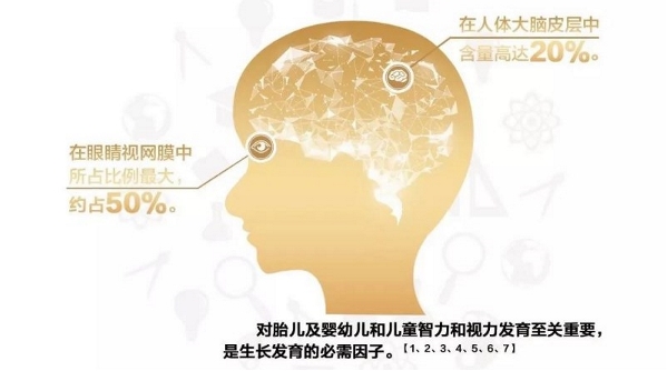 DHA是神经系统细胞生长及维持的一种主要营养物质,是大脑和视网膜的重要构成成分,在人体大脑皮层中含量高达20%,在眼睛视网膜中所占比例最大,约占50%,因此,对胎婴儿智力和视力发育至关重要。